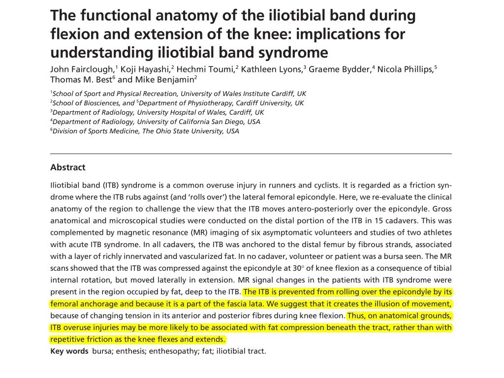 “Why are people still trying to stretch the IT band? It takes 2000lb force to increase length 1% some stretch. It resists tension naturally??”