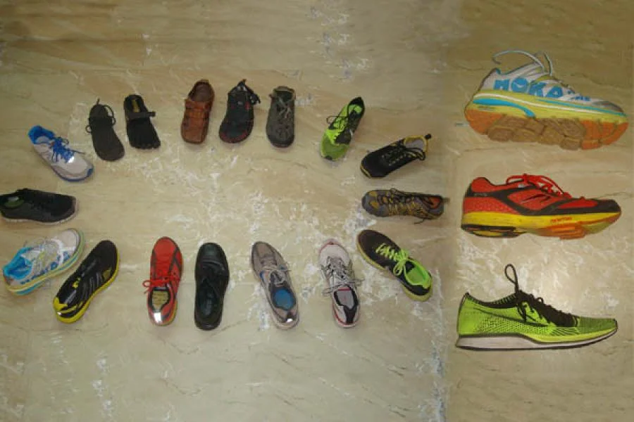 Left: Some of my running shoes, ranging from Huarache sandals (6 mm sole thickness), Vibram Five Finger (4 mm sole thickness), Hoka OneOne (60 mm sole thickness) to my leather formal Ecco shoes (30 mm sole sickness). Right: Comparing sole thickness and design of Hoka OneOne, Newton Gravity and Nike Flyknit Racer.