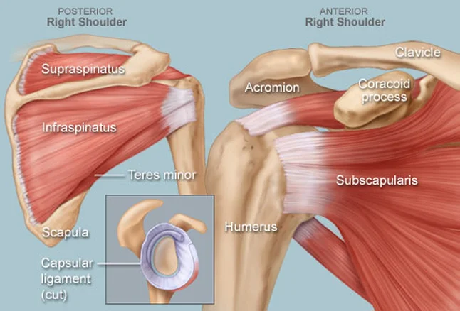 A shoulder joint (Gleno-Humeral joint) is a ball and socket joint between humerus (arm bone) and scapula (triangular flat bone behind shoulder). The collar Bone (Clavicle) connects to scapula through Acromio-Clavicular joint and chest bone (Sternum) via Sterno-Clavicular joint. A full shoulder Range of motion is a collective effort of all three joints along with good mobility from thoracic spine and ribs.