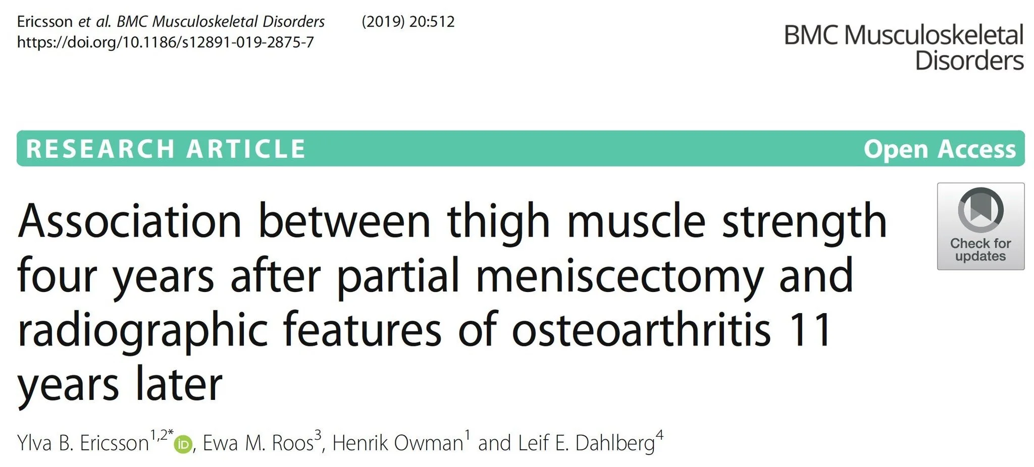 “Stronger thigh muscles 4 years after menisectomy were associated with less severe OA (osteoarthritis) in the knee of both the operated and contralateral (non-operated) knee 11 years later. May suggest that strong thigh muscles can help to preserve joint integrity in middle-aged subjects at risk of knee OA (osteoarthritis).”